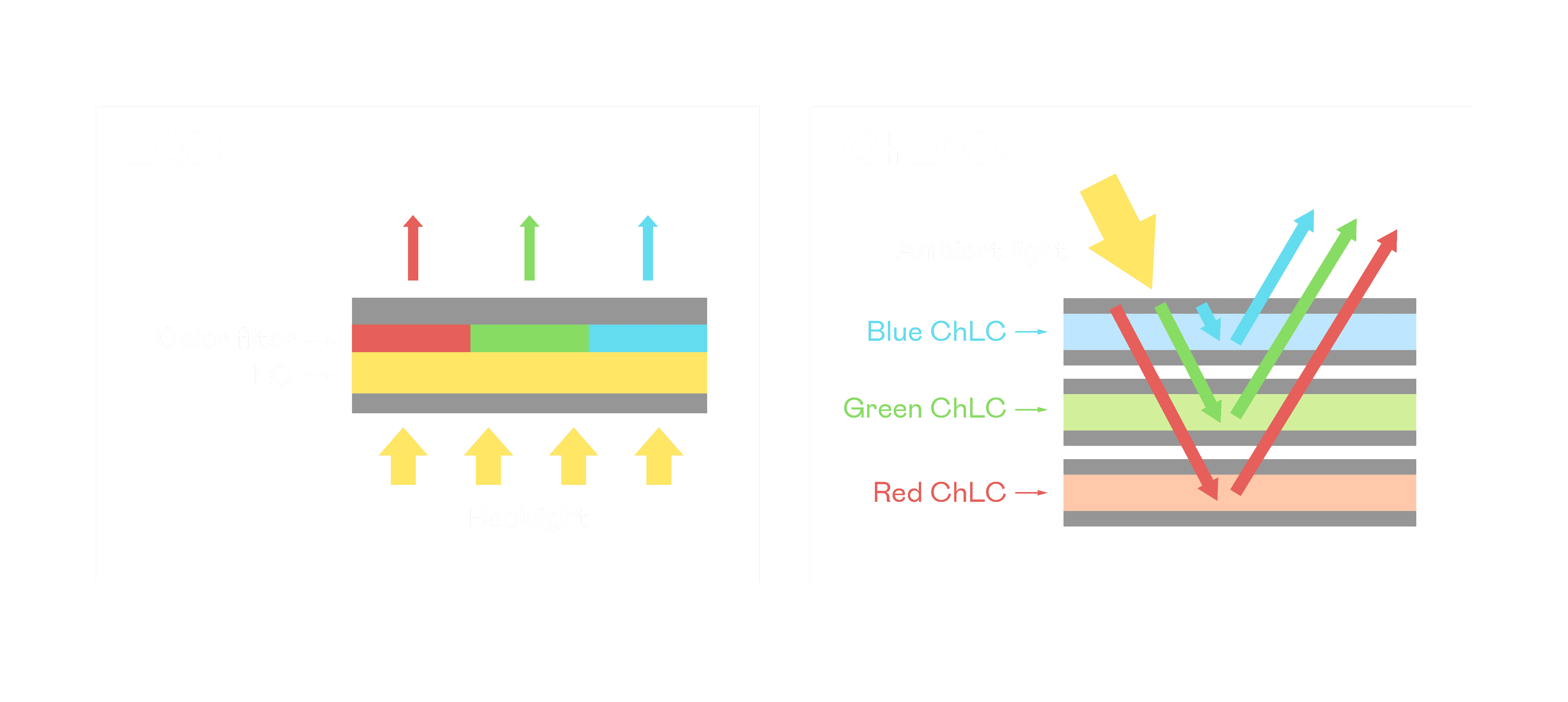 ChLCD 胆固醇液晶就如同纸张一样,,,透过反射环境光来显示影像,,因此长时间观看不易造成人眼视觉疲劳,,可达到护眼效果。。。当处于户外阳光下使用,,,,LCD 影像容易失真而不易观看,,,但胆固醇液晶仍可维持较佳的影像品质。。。。