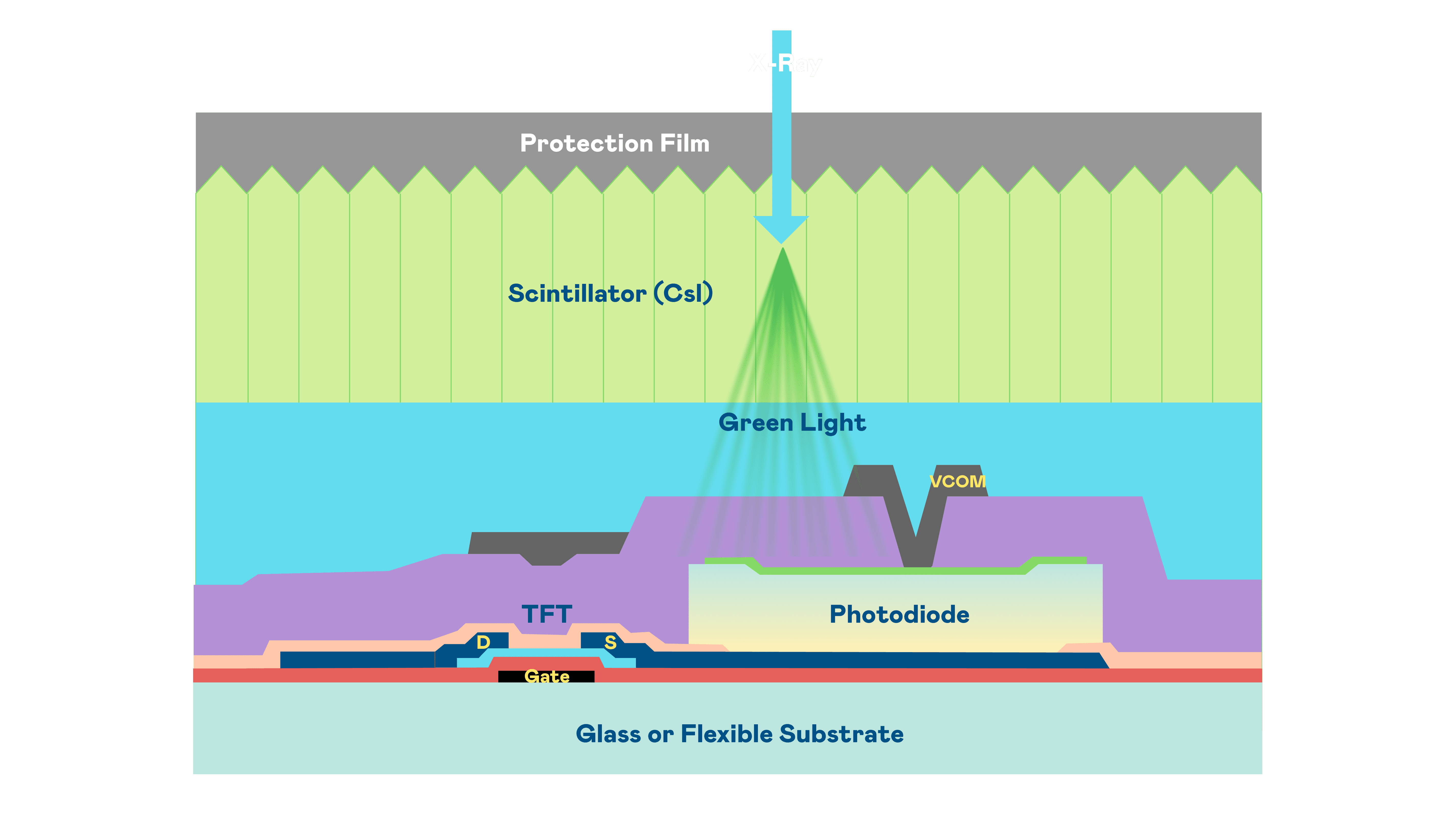 优游UB8的X光影像感测阵列使用薄膜电晶体 (TFT) 作为每个像素的读取开关,,,,搭配光电二极体(Photodiode)的光电转换元件,,,用以感测X光影像讯号。。。
